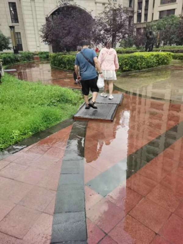 图为哈尔滨市香坊区罗马公元小区天下雨后小区院内成河的情景